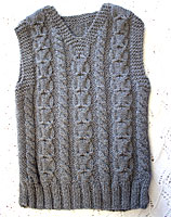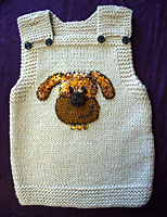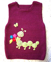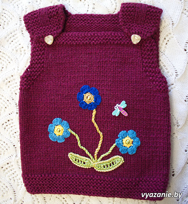 Использованы полушерстяные нитки Слонимской фабрики (Республика Беларусь). Связаны чулочной вязкой. Горловина и проймы жилета отделаны кантом, связанным платочной вязкой. По плечевым швам для удобства при надевании жилета сделана застежка на пуговицах. Петли сделаны при закрытии последнего ряда передней части жилета. На каждом жилете впереди размещена аппликация из цветов, животных, бабочек, гусениц, персонажей мультфильмов, которая связана и пришита или вышита их остатков разноцветных ниток. На передней части жилетов для мальчиков еще могут быть расположены рельефные узоры из кос.